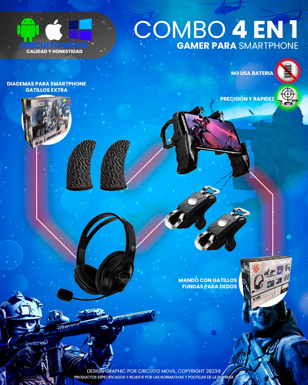 Soporte para Celular, Gatillos para disparos, audífonos, dedales